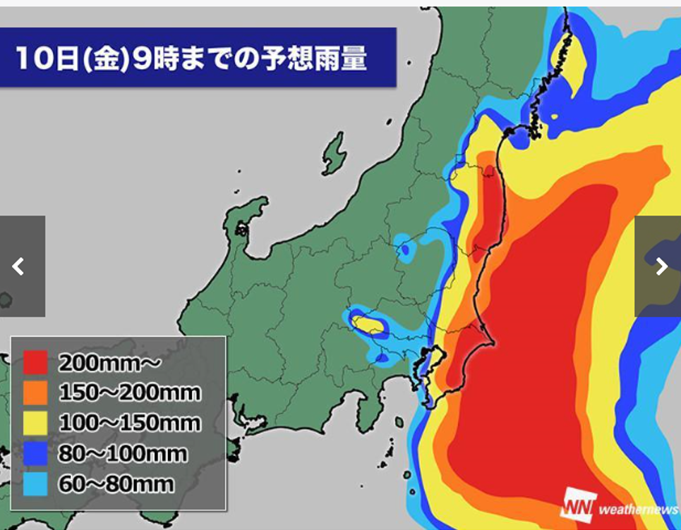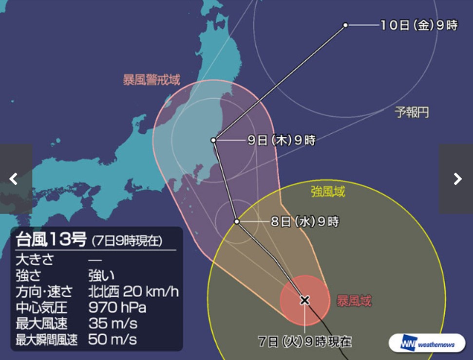 強い台風13号は、今日夜遅くから明日9日(木)昼頃にかけて、暴風域を伴って関東地方と東北太平洋側にかなり接近し、非常に激しい雨が降り、局地的には猛烈な雨が降る見込みです。