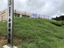 下の写真は、8月7日、小野中学校の国道沿いのフェンスに設置された看板と学校正門前に設置された看板です。他にも、小野町研修センター(教育委員会)、役場、ヨークベニマル、郵便局、コムコム等に設置していただきました。お出かけの際にはご覧ください。