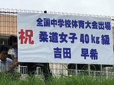 福島県中体連柔道競技大会、女子個人戦40kg級で優勝した3年吉田さんは、8月17日から広島県で開催される全国大会に会出場します。町教育委員会では、町内に「祝 全国中学校体育大会出場」の看板を設置してくださいました。本当にありがとうございます。子ども達の励みになります。