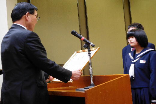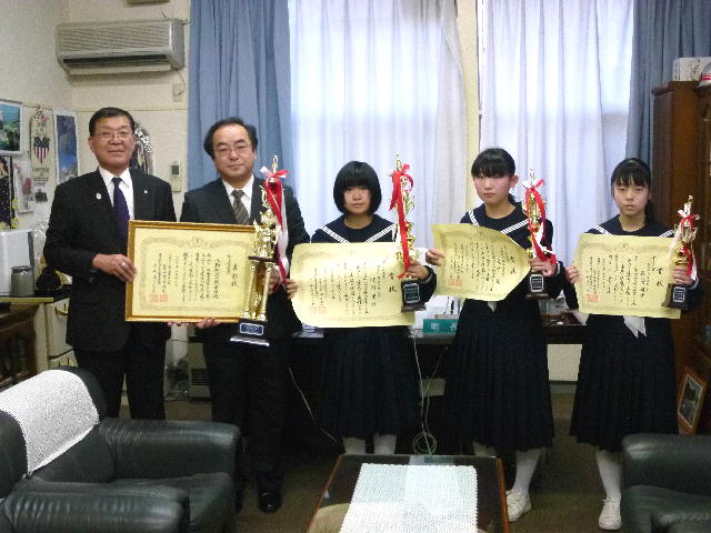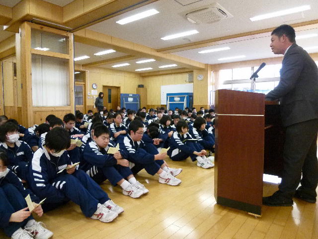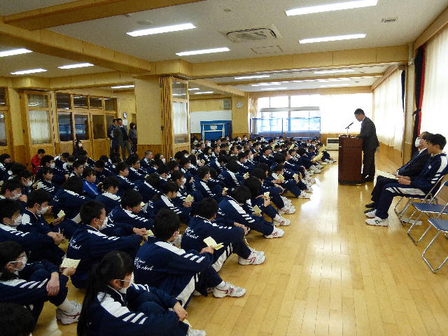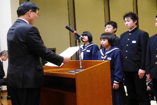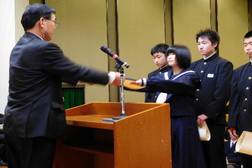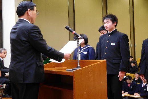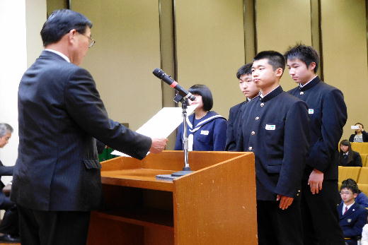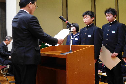 本校からは、団体の部で県書きぞめ展最高学校賞で、個人の部では、全国中学生空手道選手権大会出場の個人、県書きぞめ展大賞、同準大賞、東北大会出場の柔道個人の6名が表彰を受けました。
