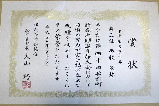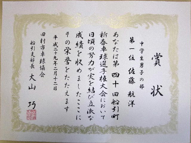 過日12日(日)に「第40回船引町新春卓球選手権大会」が田村市総合体育館を会場に開催されました。本校から出場した卓球部は、中学生男子シングルスの部で、佐藤航洋くん(2年)が優勝、西牧良弥くん(2年)が3位に入賞しました。 寒い中でも練習を頑張っている各部の成果が出ており素晴らしいです。