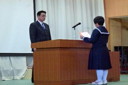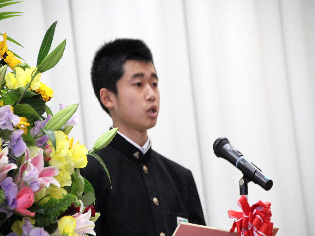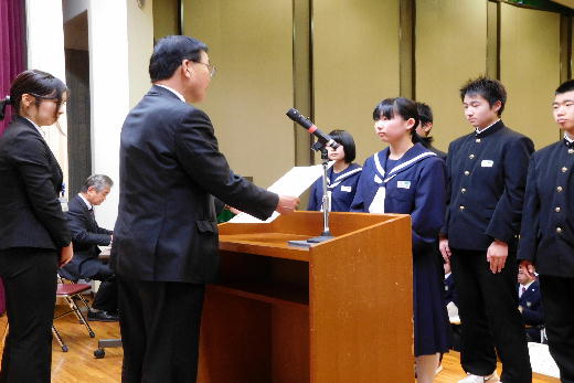 2月27日(月)に平成28年度同窓会入会式が行われました。 同窓会会長の折笠様よりご挨拶を頂いき、新入会生徒代表の石井さんが誓いのことばを述べました。そして、同窓会長様から新入会生徒代表の西牧くんに入会記念品が授与されました。