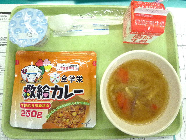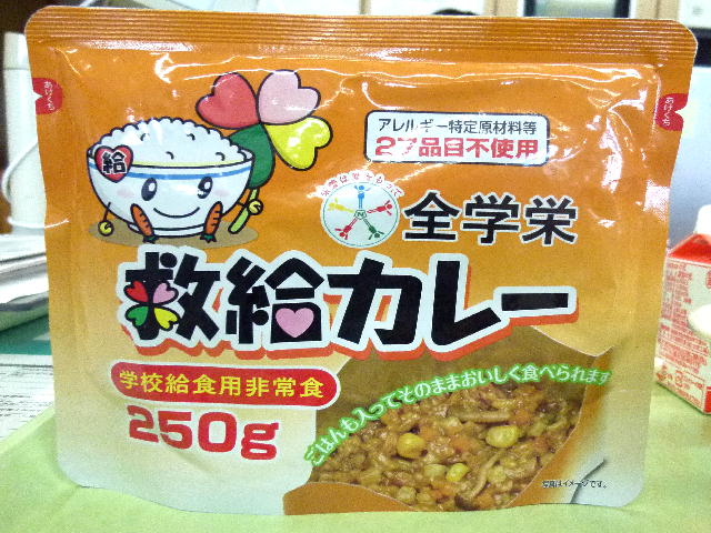 また、今年は同日に「非常食体験給食」として、学校に非常食として備蓄している「救給カレー」を食べました。