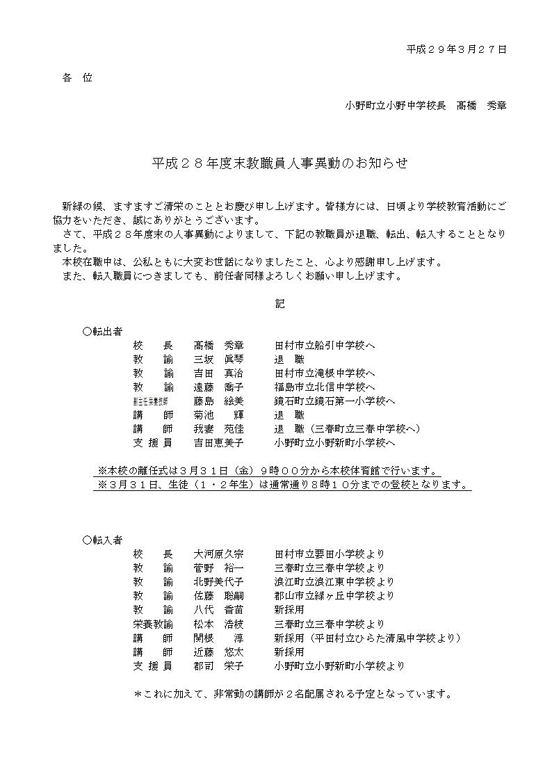 「平成28年度末教職員人事異動のお知らせ」です。