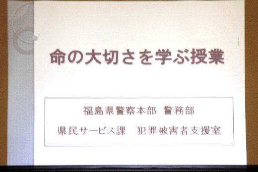 今日、全校道徳を2時間設定し「命の大切さを学ぶ授業」を実施しました。この授業は、福島県警察本部が、人格形成に重要な時期を迎えている青少年に対して犯罪被害者による講演等を行い、命の大切さを考え、被害者支援に対する意識を深めてもらうことを目的として実施しています。