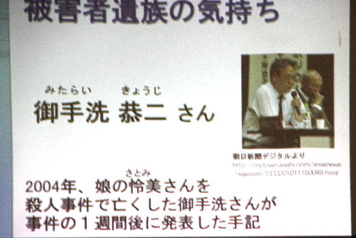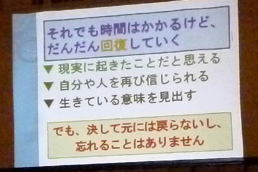 講演は、福島警察本部 警務部県民サービス課 犯罪被害者支援室 課長補佐の三本さんが、本授業の目的やねらいの説明後、被害者の手記を涙ながらに朗読しました。そして、DVDを視聴しながら被害者の方に対して何ができるか等を考え、子供を事故で亡くした母親の詩を本校の山口教諭が朗読しました。その後、気持ちをリラックスさせるために、犯罪被害支援室第2課心理カウンセラーの庄司さんからリラクセーションをしていただきました。
