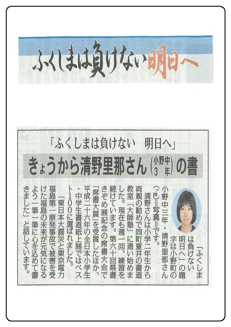 福島民報新聞に連載の上記の題字を、3年清野里那さんが依頼を受け、清野さんの書が、6月1日~30日までの1ヵ月間にわたり掲載されています。 新聞記事もあわせて紹介します。
