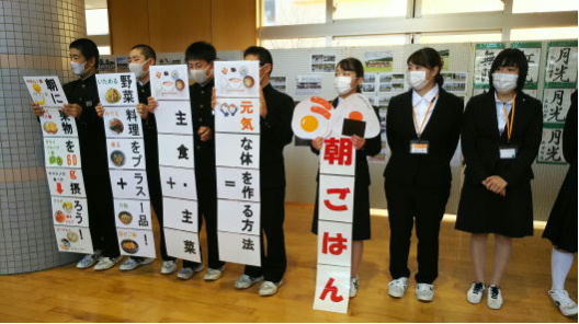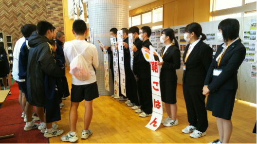 今週は「朝食調べ週間」です。保健委員会が毎朝「朝食を食べてきましょう」「朝食を食べるとこんなにいいことがありますよ」ということを具体的に呼びかけています。今日は管理栄養士になるために実習に来ている3名の大学生の方が作ってくれたものをもって一緒に呼びかけました。