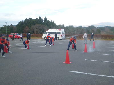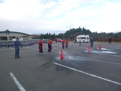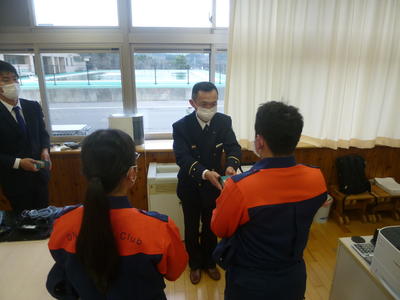 本日6校時に避難訓練ならびに少年消防クラブの結団式を行いました。避難訓練では少年消防クラブの代表10名が水消火器による消火訓練を行いました。また、その後校長室にて田村消防署小野分署長様はじめ4名の署員立ち会いの下、3年生の代表2名が参加して結団式を行いました。