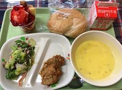 サラダに手作りフライドチキン、汁物はコーンスープ、デザートはなんといちごパフェかチョコレートパフェで2種類から1つ選ぶことができました。こんなおいしい給食が食べられるのは当たり前ではないのです。今日も「冬至献立」。24日(火)の今年最後の給食まで「ありがとう」の感謝の心を持ち、いただきましょう。「おいしい給食、いつもありがとうございます。ごちそうさまでした。」