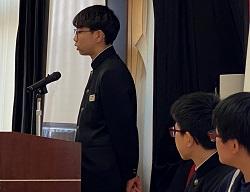 れたことに感謝します。この2学期84日間、生徒一人一人が自分のよさを発揮しようと日々、「全力投球3S(Study・Sport・Speech)」・「3つの氣(根氣・本氣・覇氣)」+「笑顔」で生活できました。式では英語弁論大会や駅伝大会、新人戦、秋篁祭等の様子を写真で振り返りました。多くの行事を通して、子どもたちは決してあきらめませんでした。また、多くの人に支えられて成長する場面が多くありました。子どもたちはいつも笑顔でプラス1の心を忘れずに自分自身を高めていたこともうれしかったことです。明日から1月7日(火)まで冬休みです。健康と安全に気をつけて、よい年を迎えてください。令和2年1月8日(水)、生徒の笑顔に会えることを楽しみにしています。今年一年「ありがとうございました。」※写真は生徒発表、3年矢吹さん。