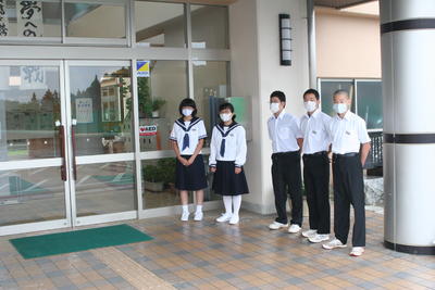 「あいさつ日本一」を掲げる小野中学校は、生徒会が中心となり、生徒玄関にて朝のあいさつをしています。