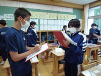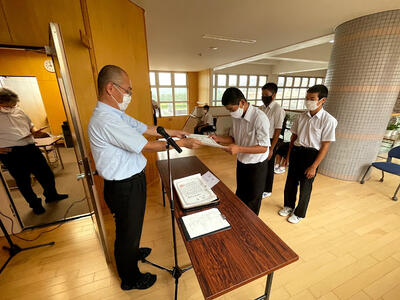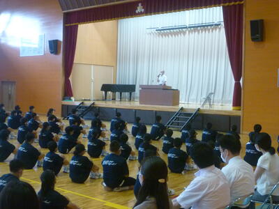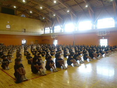 本日、1学期の終業式を行いました。換気をしながらスペースを空けて、久しぶりに体育館に全員が集合しての終業式でした。校長から今年のテーマである「笑顔と意欲」について話をして、目標を持って夏休みを過ごすように話がありました。また中体連県大会の陸上、柔道での表彰も行い、インタビューコーナーもありました。