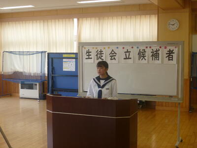 2021年9月9日 15時59分本日、生徒会の役員選挙がありました。今回も残念ながら感染防止のためにテレビ会議を使っての演説会になりました。また、今回はいわゆる「おのごん掲示板」に候補者の政見放送ならぬ紹介ビデオも流しました。候補者みんながよりよい小野中に向けてしっかりと演説をしていました。