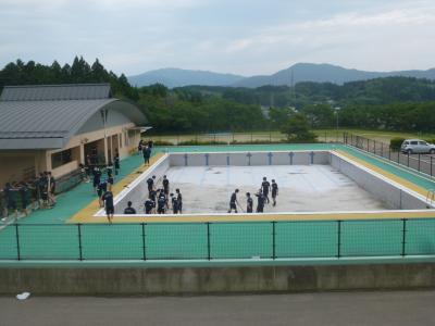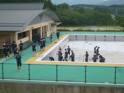 いよいよプールのシーズンです。テレビではプール開きのニュースが流れていましたが、ちょっと遅れて小野中学校では本日からプール清掃を行っています。なんだか楽しそうです。