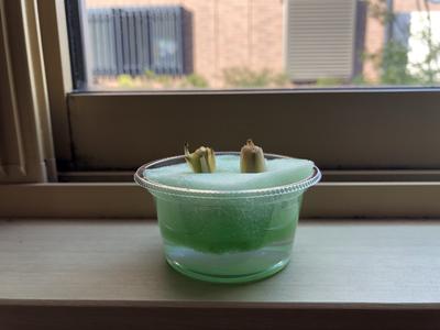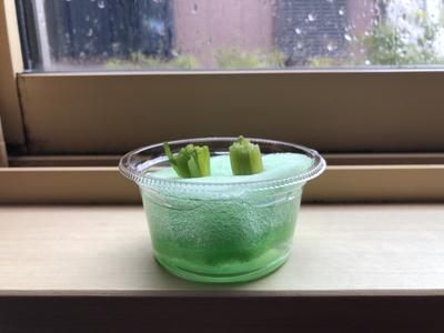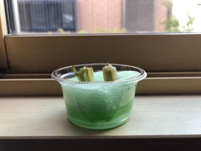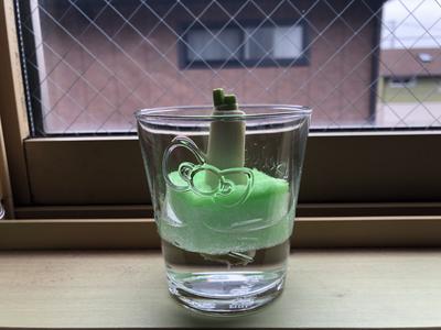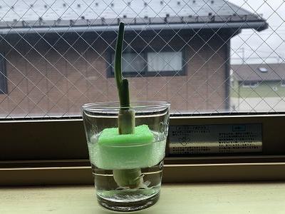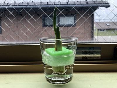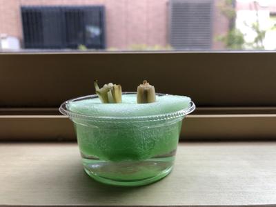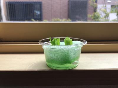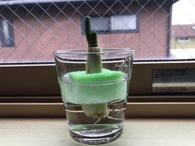 考えたこと・・・2年2組の授業の際、豆苗や大根でリボベジに挑戦している生徒がいたので、レポートを見るのが楽しみになった。私の長ねぎもしっかり育てるぞ。