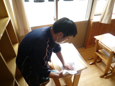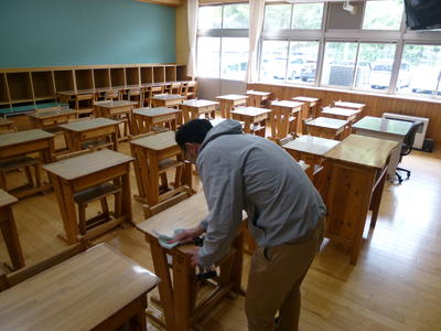 さて、5月18日(月)からの学校再開に向けて、本日は職員全員で校舎内の除菌作業を行いました。