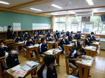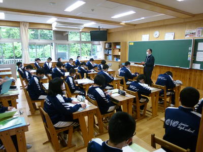 授業も全員がマスク着用、机を離した状態で行いました。話し合いや実習などで制限を受けますが、久々の授業に先生方も生徒達もみんな笑顔でした。(校長)