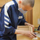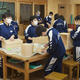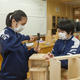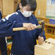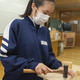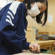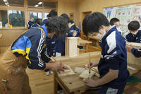 技術の木工の授業のようすです。生徒はマスクをして無言で作業をしています。