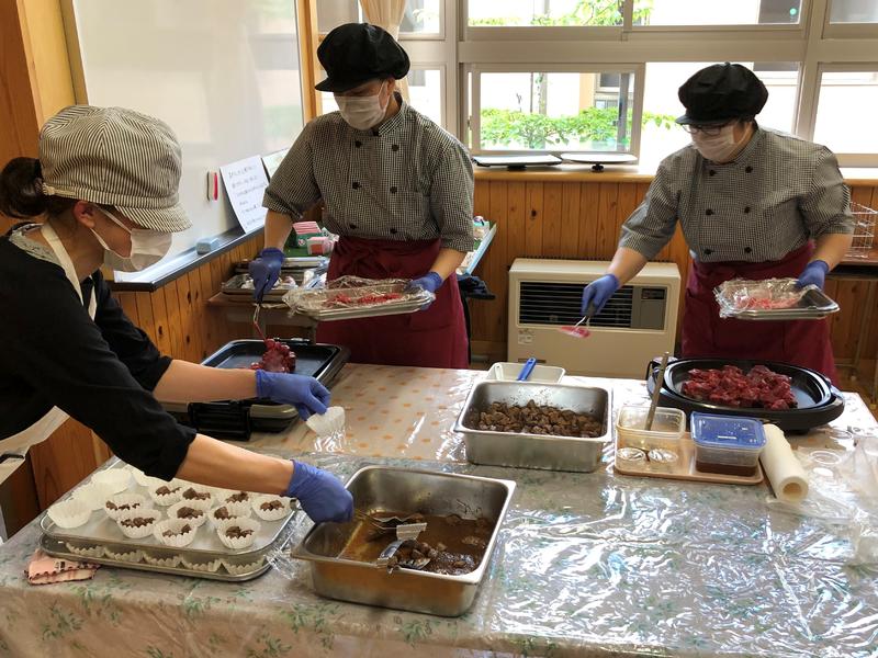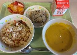 ・「たこめし」、「手作り豆腐ハンバーグ」、「パンプキンポタージュ」、「フルーツポンチ」、牛乳