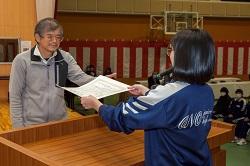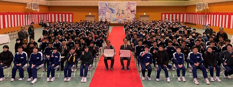 3月3日(火)6校時の全校集会後、3年生の生徒会役員が中心となり、サプライズで、今年度で定年退職する校長と割谷先生のための卒業式を開いてくれました。突然でびっくりしました。退職者が登壇し、校長は3年の根本さんから、割谷先生は3年の藤井さんから「卒業感謝状」を、また、校長は先﨑さんから、割谷先生は磯さんから「一人一人からのメッセージ(学級ごと)」をいただきました。涙があふれました。最後に「校歌」を歌っていただき、全校生で写真も撮りました。小野中での最高のプレゼントになりました。小野中の子どもたちはすてきですね。先生方にも感謝です。本当にありがとうございました。退職の日まで、あと22日。