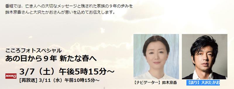 3月11日(水)、臨時休業6日目です。東日本大震災から丸9年が過ぎました。3月7日(土)NHK「こころフォト スペシャル:あの日から9年 新たな春へ」の再放送が本日10時15分に放映されます。お時間があればぜひご覧ください。【ナビゲーター】鈴木京香さん、【語り】大沢たかおさんです。