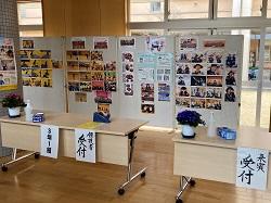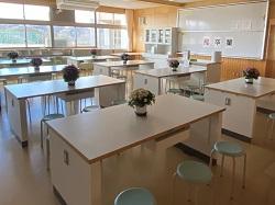 【写真 左・中:受付(マスク・消毒液あり) 右:保護者控え室(被服室と調理室の2教室】
