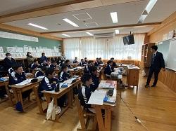 【写真 左:情報モラルで講演する加藤様 中・右:授業参観「1年英語・2年数学」】