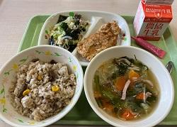 2月17日(月)は、私の希望献立でした。主食は黒にんにくピラフ、主菜はフライドチキン、副菜はレモンドレッシングサラダ、汁物はコンソメスープ、牛乳+ミルメークいちごです。豪華メニューですね。小野町産の黒毛和牛や黒にんにくの入った「小野町給食センターオリジナルメニュー」のピラフは最高に美味しかったです。ごちそうさまでした。感謝・感謝。こんな美味しい給食があと少しなんて悲しいです。
