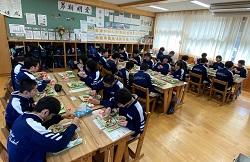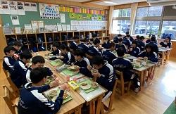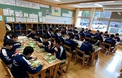 【写真 3年生の給食風景。3年生にとってはみんなで食べられる給食はあと14回です。一日一日感謝の心で美味しくいただきましょうね。左から1組・2組・3組です。】