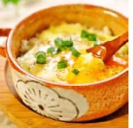 【写真 左:朝の活動の様子 中:保健委員作成した資料の紹介 右:荻野先生考案の「とろけるチーズと卵ごはん」】
