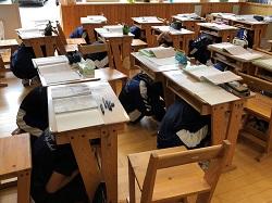 県民の防災意識の高揚と自助・共助の取組促進を図るため、地震が発生した時、自分の身を自分で守るために真っ先に行うべき安全確保行動「(1)まず低く、(2)頭を守り、(3)動かない」を学び、身に付ける機会として、県下一斉安全確保行動訓練「シェイクアウトふくしま」が8月30日に実施され、本校は9月4日(水)に参加しました。昨年度、福島県では185,208名が参加した訓練です。写真は、3年3組の様子です。