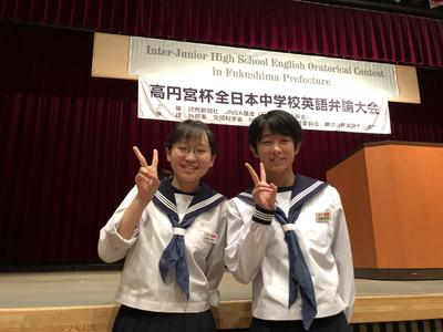 ※ 全国大会は「高円宮杯第71回全日本中学校英語弁論大会」、決勝予選大会は11月27日(水)・28日(木)に東京都赤坂区民ホールで行われ、福島県は第4部(北部日本地区)グループで28日午後が大会になります。決勝大会には各予選を勝ち抜いた27名で29日(金)に東京都千代田区にある「よみうりホール」で行われます。福島県を代表し大和田さんが出場します。