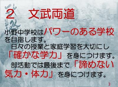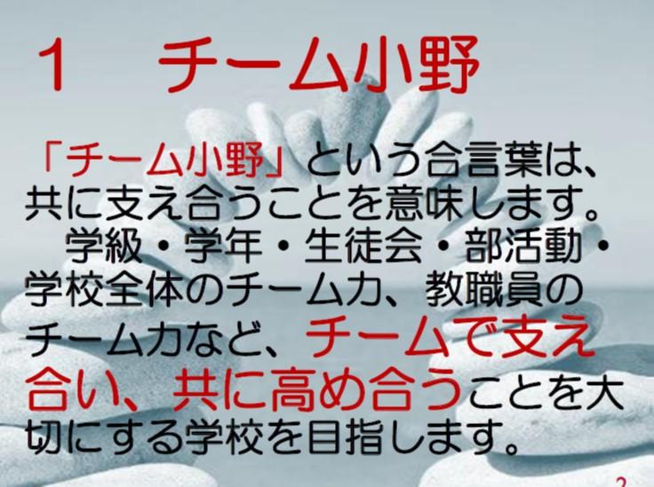 4月17日(水)、学校だより2号を発行しました。今年度もプラス1(ワン)の生き方のできる子どもたちを育てていきます。小野中の合言葉「プラス1」で頑張っていきましょう。始業式では新たに3つの合言葉についてもお話ししました。チーム小野で文武両道、あいさつ日本一の学校を目指します。