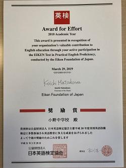 「平成30年度、実用英語技能検定に多数参加され、英語教育に多大な成果をあげられた」ということで、日本英語検定協会から小野中学校が「奨励賞」をいただきました。高校レベルの準2級・2級合格者が10名や中学卒業レベルの3級は32名等、子どもたちの頑張りと子どもたちを熱心に指導してくださった英語科の先生の頑張りの成果だと思います。今年度も小野町から、英語・数学・漢字検定それぞれの級につき各1回検定受験料を助成していただきます。5月31日には英語検定の1回目(希望者)が実施予定です。頑張れ小野中生!