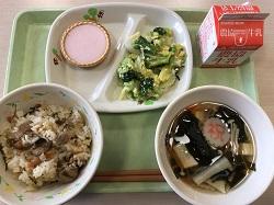 【教の献立】沖縄風混ぜご飯、菜の花サラダ、若竹汁、手作りチーズケーキ、牛乳