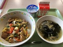 2月4日(月)の献立、主食は「ダッカルビ」、汁物は「わかめスープ」、デザートはヨーグルト、牛乳。