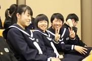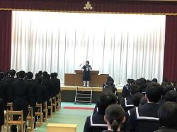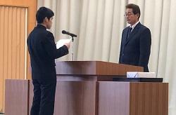 2月26日(火)6校時、同窓会長の折笠一郎 様にお越しいただき、同窓会入会式を挙行し、3年生の入会をお祝いいただきました。今年の3年生101名で、本校の卒業生は11,135名になります。式では、卒業生を代表し、橋本さんが誓いの言葉をのべ、冨澤さんが同窓会からの記念品(マグカップ)を授与されました。誓いの言葉を紹介します。