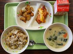 ◎「献立を教えてください」:主菜はあじのピザ焼き、副菜はバジルポテト、汁物は豆乳のクラムチャウダー