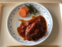 7月3日(火)の1年2組の調理実習の献立は「ムニエル」。校長の分も作ってくれました。とってもおいしかったです。ごちそうさまでした。右の写真は6月に行われた調理実習、1年1組の「煮込みハンバーグ」です。こちらもとっても美味しくいただきました。