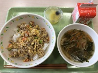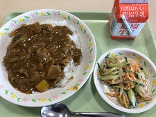 7月20日(金)が1学期最後の給食でした。献立は、主食:夏の味覚カレー、副菜:バンバンジーサラダ、デザート:シューアイス、牛乳でした。