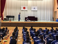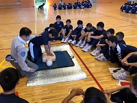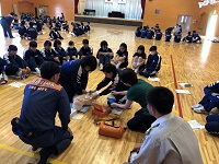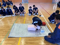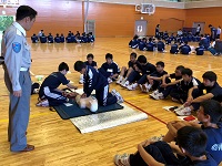 6月5日(火)1・2校時、2学年を対象に、田村消防署小野分署副分署長の影山様他6名の署員の方に来ていただき、「心肺蘇生法講習会」を体育館で行いました。「救命の連鎖」についてのお話の後、心肺蘇生とAEDを用いた一次救命処置の手順についての講習です。最初に、署員の方が手順について説明しながら実際の動きを行います。①意識の確認→②呼吸をみる→③胸骨圧迫→④気道確保→⑤人工呼吸→⑥胸骨圧迫と人工呼吸→⑦AED。手順を教えていただき、次は、5つのグループに分かれての訓練です。発見者、119番通報者・AEDを持ってくる者の役割分担しながら真剣に取り組みました。最後に生徒を代表し島本さんがお礼の言葉を述べました。