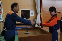 【写真 左:団員証を授与された3年村上さん 中:誓いの言葉を述べた3年大和田さん 右:少年消防クラブ員】