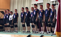 5月22日(火)、生徒会総会後に第1回表彰を行いました。4月27日に行われた校内陸上大会学級対抗戦、4月から5月20日までに行われた大会、学校外ですが県ジュニア空手道選手権大会の表彰を行いました。田村支部陸上大会の表彰では、第1位の女子低学年4×100mリレーの生徒に賞状と盾が、また、三春ロータリ野球大会第1位の野球部代表生徒に賞状と優勝旗が授与されました。来週に行われる中体連での活躍を期待しています。おめでとうございました。