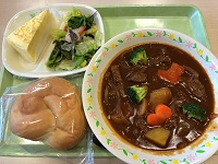 12月21日(木)、今日の給食はすごかったです。「クリスマス献立」です。主食は米粉のバターロール、副菜はレモンドレッシングサラダ、汁物は小野町産牛肉のビーフシチュー、デザートはセレクトケーキで3種類から1つ選ぶことができました。ビーフシチューはクリスマスカラーの「赤(にんじん)」と「緑(ブロッコリー)」を意識して作られ、にんじんはハート型でした。また、牛肉は町から寄贈していただいた小野町産の黒毛和牛が使われた特別豪華なビーフシチューでした。まず。牛肉を焼いて、そして2時間かけて煮込まれたそうです。大きな牛肉がたくさん入っていてうれしかったですね。口に入れるととろけてしまうくらい柔らかくておいしかったです。こんなおいしい給食が食べられるのは当たり前ではないのです。明日も、「ありがとう」の感謝の心を持ち、今年最後の給食をいただきましょう。「おいしい給食、いつもありがとうございます。ごちそうさまでした。」
