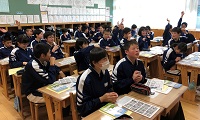 【写真 5校時「学級活動」の様子 左:1年1組 中:2年2組 右:3年(学年集会の後、各学級で「学級活動」を行いました)】