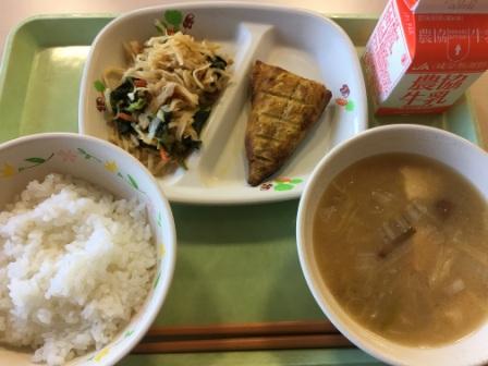 【写真 左:本日の献立「ご飯、さばのカレー焼き、切干大根の炒め物、なめこのみそ汁、牛乳」 中・右:11/6 AM7:55 小野町の空がすてきでした】