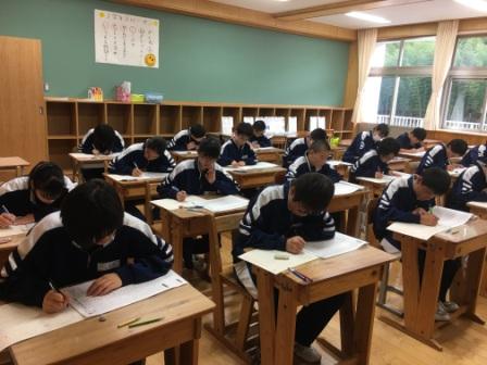 11月10日(金)、第2回漢字検定が行われ、1~3年生35名が受検しました。高校卒業相当に当たる「2級」にも3名(2年生2名+3年生1名)が挑戦しました。第3回は2月9日(金)に予定されています。また、来週17日(金)には数学検定が行われます。子ども達、頑張れ! 【写真 左:1・2年生 右:3年生 みんな頑張っています!】 ※ 明日は、町内小学校の学習発表会があります。飯豊小→夏井第一小→小野新町小→浮金小の順に観に行きます。楽しみです。 ※ 大会もあります。野球部は第20回関東・東北・北信越少年新人軟式野球大会が宇都宮市で開催され、東北代表として参加します。1回戦は茨城県の中学校、勝ち上がれば2回戦は栃木県と福井県の勝者と戦います。自信を持って戦ってきてください。柔道部は福島県中学校新人柔道大会が郡山西部体育館で開催されます。自分の得意技で勝負してください。小野中生頑張れ~!
