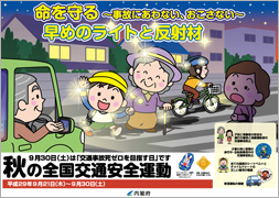 2017年9月20日 14時38分 9月21日(木)から30日(土)までの10日間、秋の全国交通安全運動が始まります。交通安全意識を高め、交通ルールの遵守・交通マナーの実践を習慣づけ、交通事故に絶対にあわない、おこさないようにしましょう。