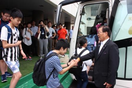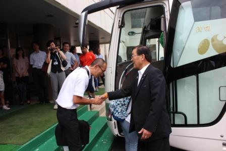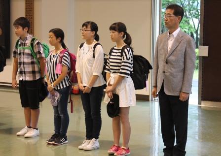 8月1日(火)午前7時45分、多目的研修集会施設において、サマーキャンプの出発式が行われました。あいにくの小雨模様でしたが、団員16名はアメリカにたくさんの希望を胸に、大和田町長と握手を交わしてバスに乗り込み、先生方や保護者の方々に見送られて、元気に出発しました。先ほど、引率者の本校竹川先生より成田で出国の手続きを終えて、全員元気との連絡がありました。まもなく日本を離れます。アメリカですばらしい体験をして、8月8日(火)に元気に帰ってきてほしいです。「行ってらっしゃい!」